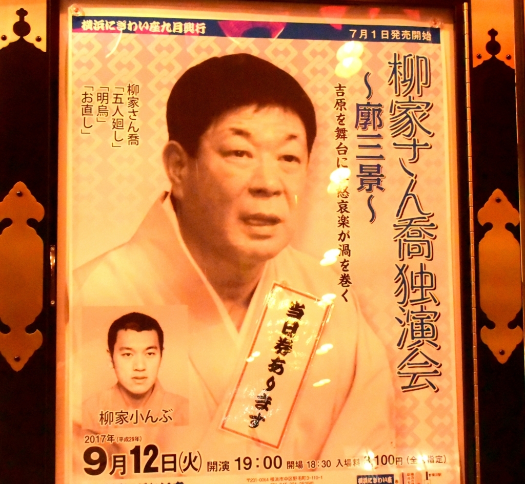 私の大好きな柳家さん喬師匠が、「横浜にぎわい座」で独演会を開くとの情報が入り、ずいぶん前にチケットを購入しました。