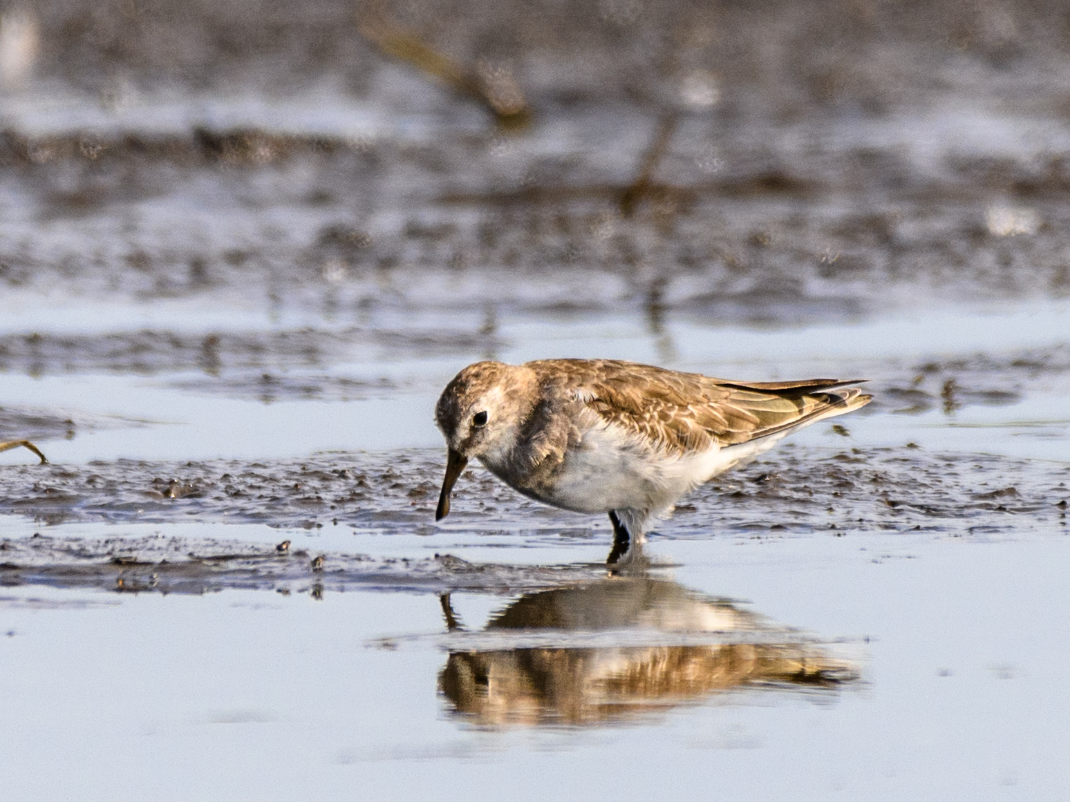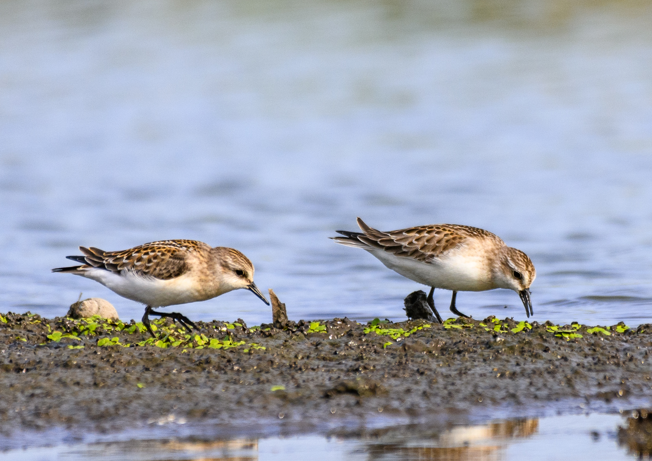 そばに幼羽のウズラシギが一羽採餌していました。 ⇩