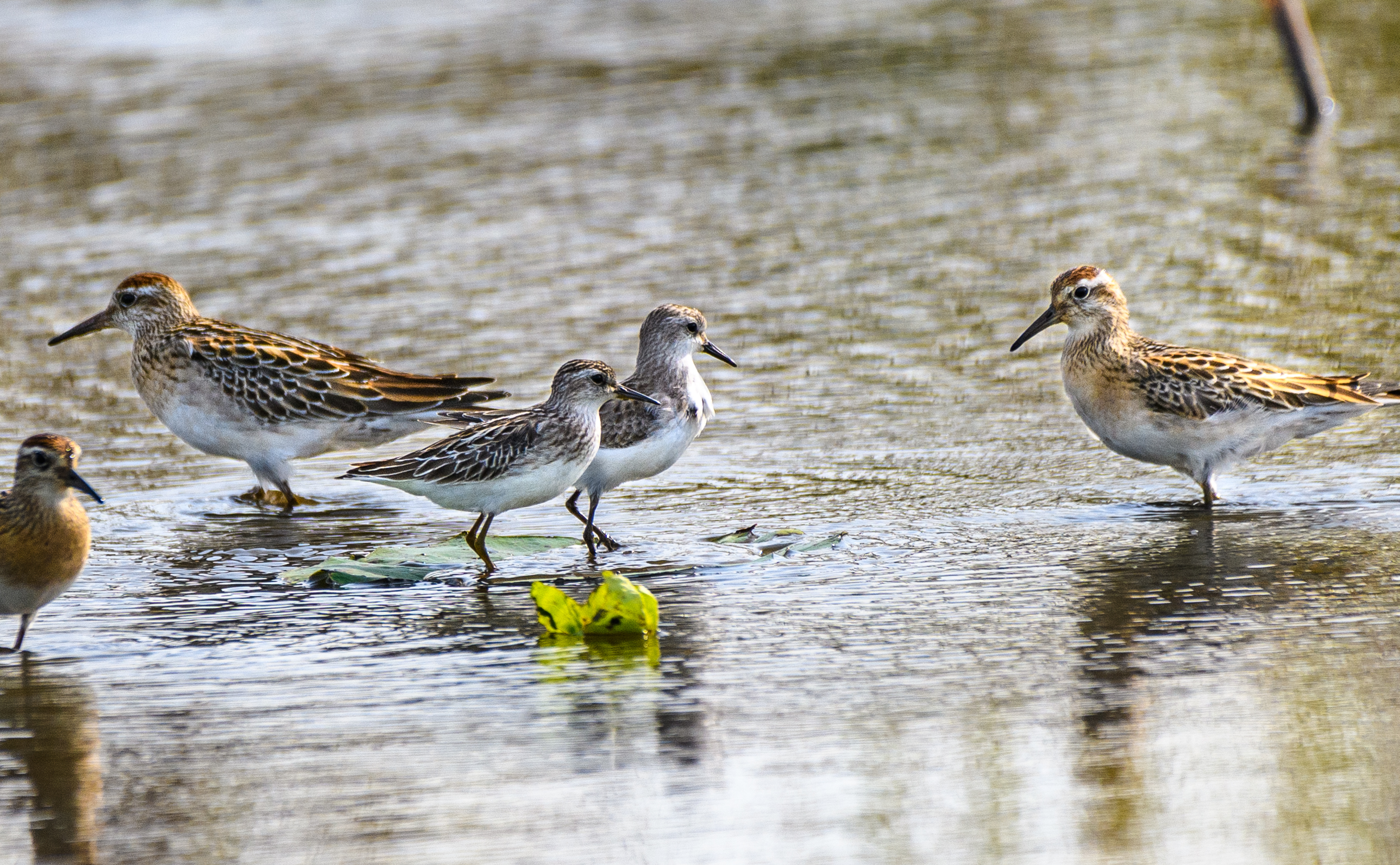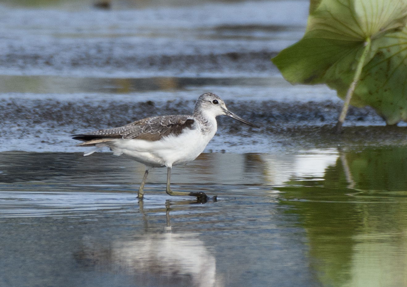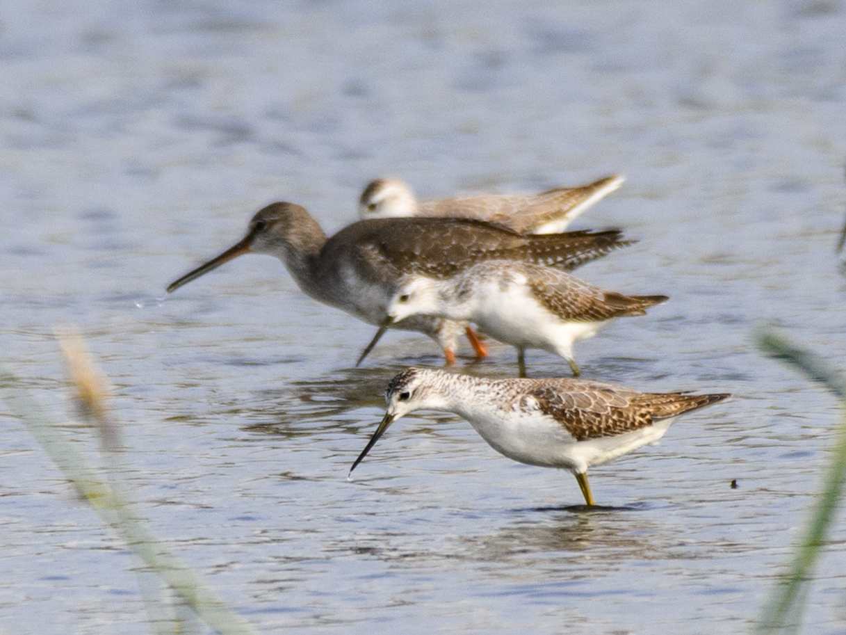 すぐそばの蓮田を覗くとそこにはコアオアシシギの群れが…… ⇩