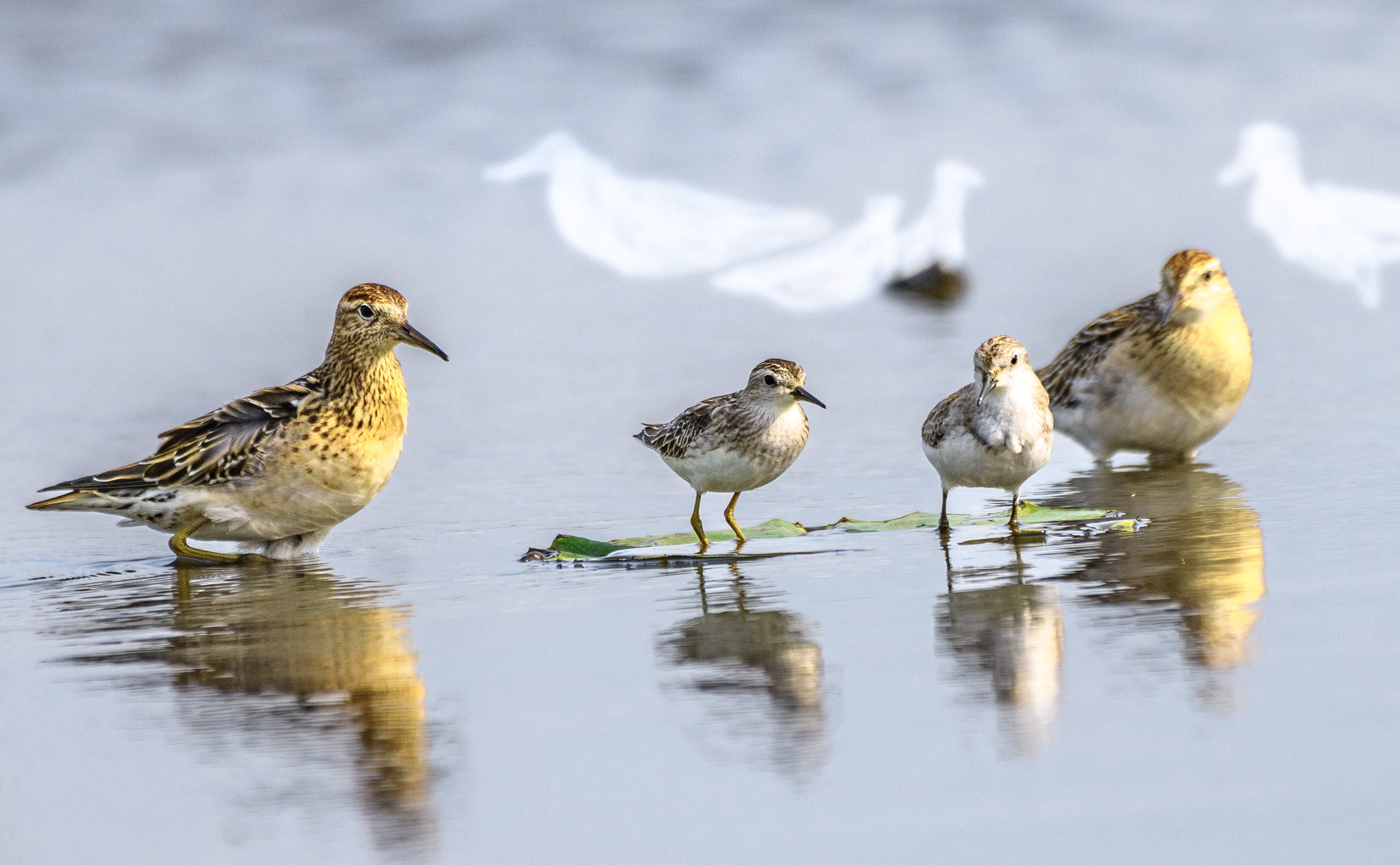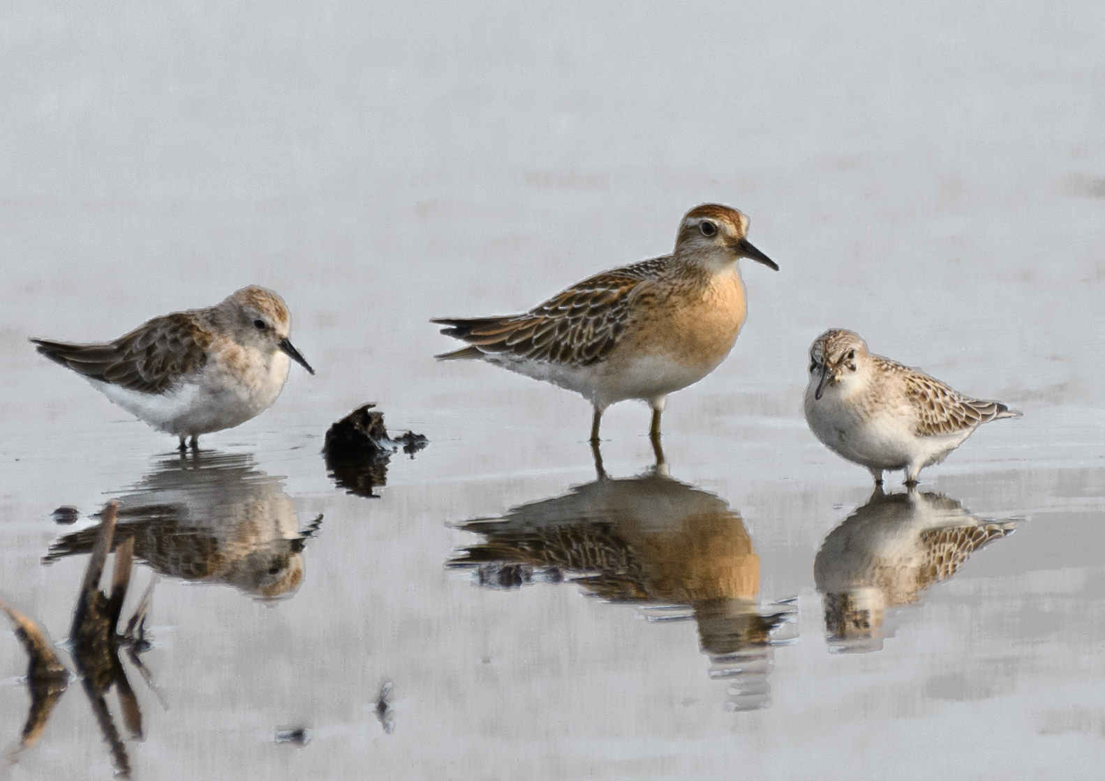 左からウズラシギ→ヒバリシギ→オジロトウネン→ウズラシギ 大きさの違いがよくわかりますね。 ⇩